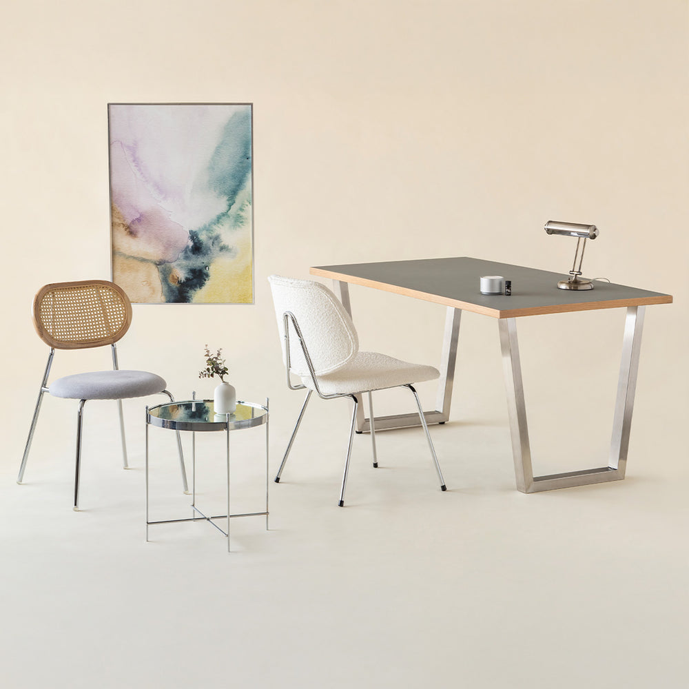 ナチュラルテイストなインテリアの中に、シルバーアイテムが一点入ることで、ややフォーマルな上品さがプラスされます。あたたかみがありすぎるのは少し苦手、という方におすすめ。