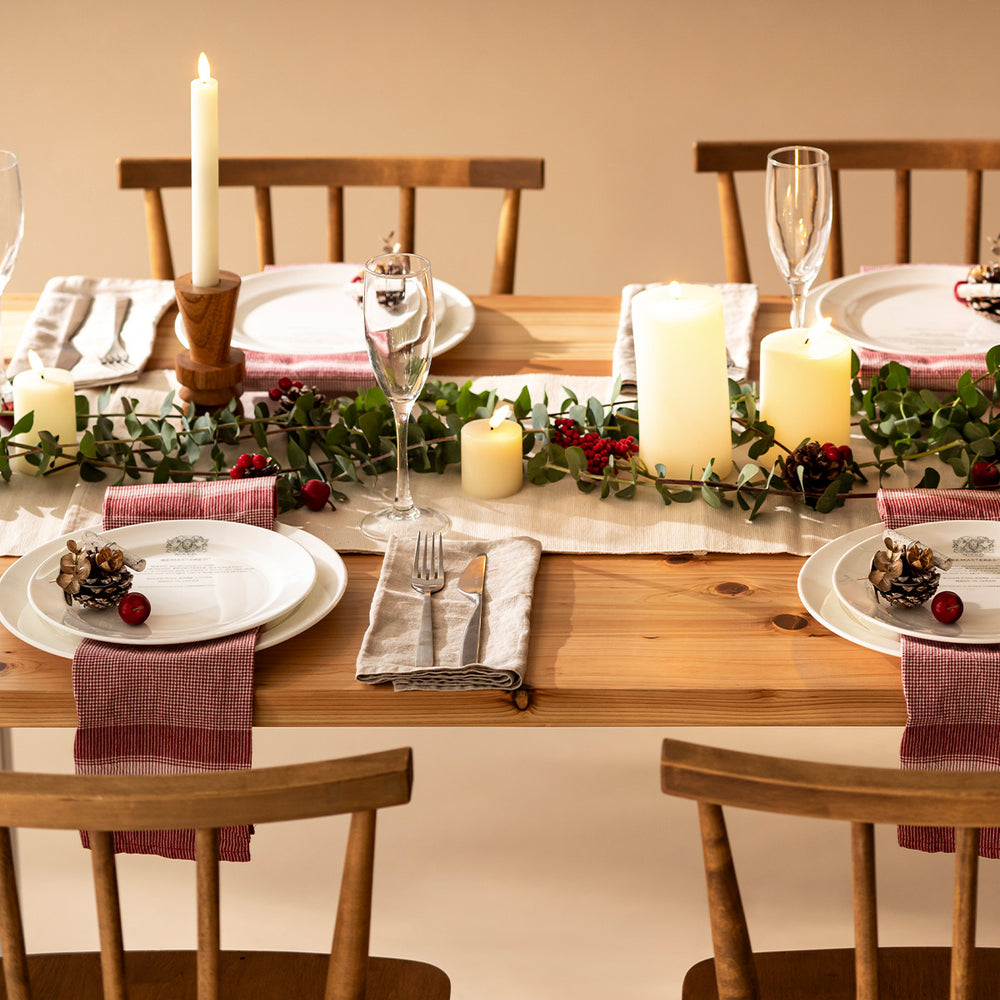 ナチュラルであたたかみのある杉無垢材のナチュラルなテーブルとも相性抜群。 木の質感と落ち着いた赤の組み合わせは、どこか懐かしく、温かなクリスマスの情景を思い起こさせてくれます。
